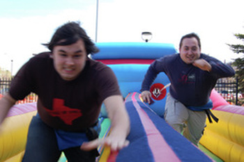 The bungee run is as much fun to ride as it is to watch! Each competitor gets strapped into a vest which is attached to a giant bungee cord. The goal is to run as far as possible and lay your marker on the Velcro strip before the bungee ‘snaps you back to reality’. Whoever’s marker is farthest down the track wins!